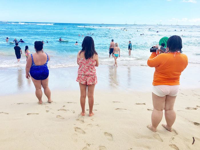 ロイヤルハワイアン前のビーチで恒例のぽっちゃり対決♪60代ままリン勝負の結果は・・・